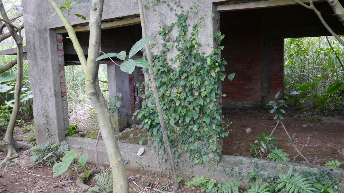 進入廢煙道之前經過一棟廢棄人工建築,天花板都已穿洞,相當奇特。